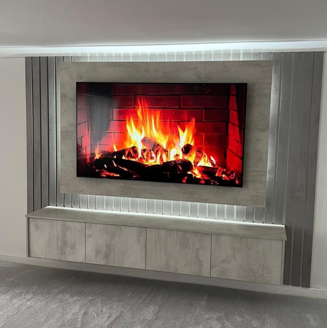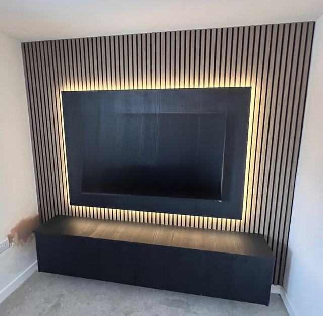 This Media Wall supplied and fitted consisting of 2.4m wide acoustic panels, 2m wide floating storage units, TV panel and LED lighting . Choice of colours.