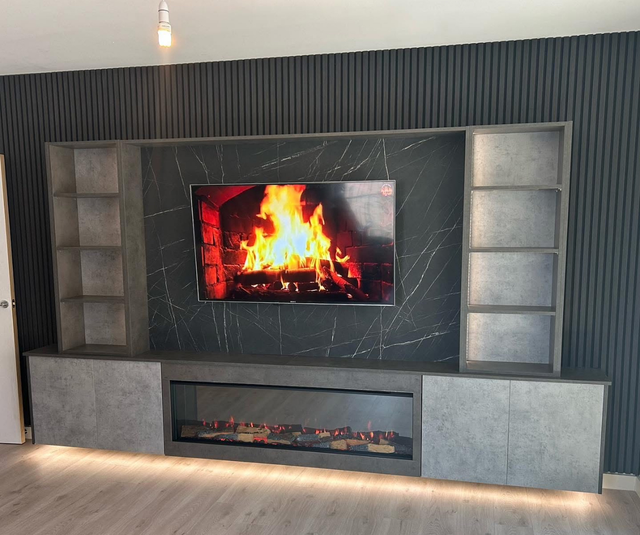 This Media Wall supplied and fitted consisting of 4.2m wide acoustic panels, 3.4m floating storage unit, 2x open shelves, 60” electric fire, TV panel and LED lighting . Choice of colours.